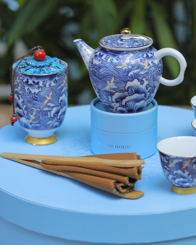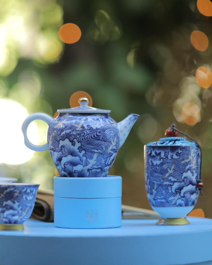 Σετ δώρων με τελετουργικά μείγματα τσαγιού, παραδοσιακό δίσκο τσαγιού από πηλό yixing και μοναδικά κιτ ταξιδιού για τσάι. Σετ τελετουργικών δώρων με πολύτιμα χρυσά σκεύη από μπαμπού.