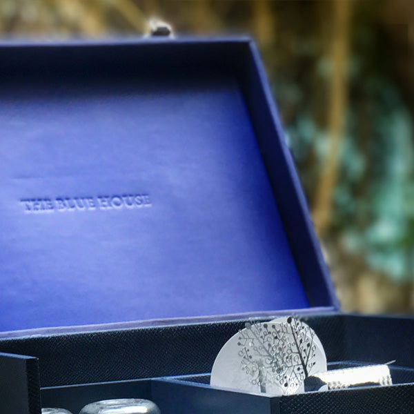 The collection also includes Holland blue coasters for an elegant touch and silver keys to securely lock the box.